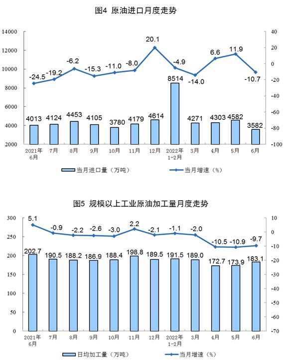 原油加工量降幅收窄。6月份 ,加工原油5494万吨 ,同比下降9.7% ,降幅比上月收窄1.2个百分点 ,日均加工183.1万吨。1—6月份 ,加工原油33222万吨 ,同比下降6.0%。